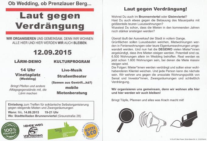 Sonnabend, 30. April 2016, 16.30 Uhr: U-Bahnhof Osloer Straße, Berlin-Wedding - Hände weg vom Wedding!