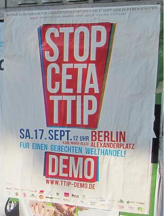 Gleichzeitige bundesweite Demo 7 Städten: Berlin, Hamburg, Köln, Frankfurt, Stuttgart und München oder Nürnberg: Großdemo: Stopp TTIP und CETA - Für einen gerechten Welthandel. Infos für Berlin: 12 Uhr am Alexanderplatz.