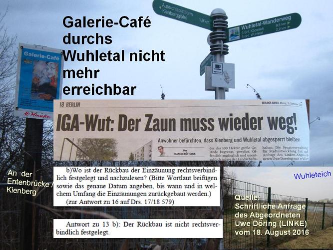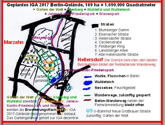Durch die IGA 2017 Berlin, auf die wir uns alle freuen sollen und wo Kindern und Jugendlichen die Verantwortung für die Natur nahegebracht werden soll, wird das mit EFRE- und Aufbau Ost-Mitteln renaturierte Gebiet sich von einer artenreichen urwüchsigen Natur in eine artenarme "gestaltete Natur" wandeln.