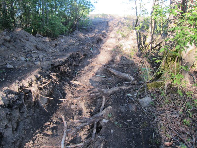 Überall wachsen Steine, Schrott, Plastik und Autoreifen aus dem Boden. Allerdings werden auch Baumwurzeln, die in der flachen Humusdecke versuchen, Halt zu finden, wie nutzloser Abfall behandelt. |