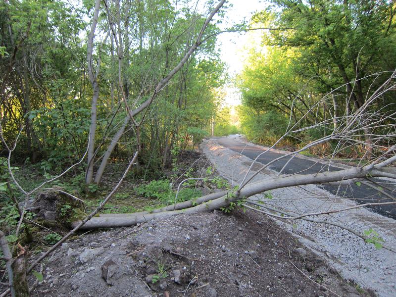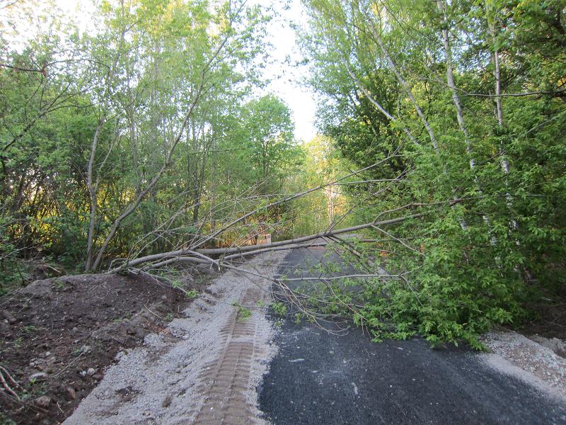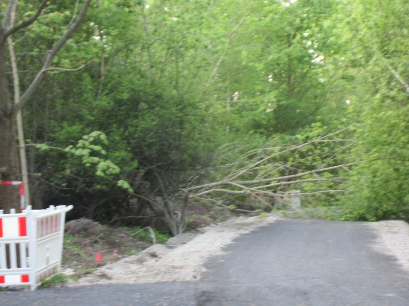 Straße gesperrt durch quer darüber liegenden, belaubten Baum |