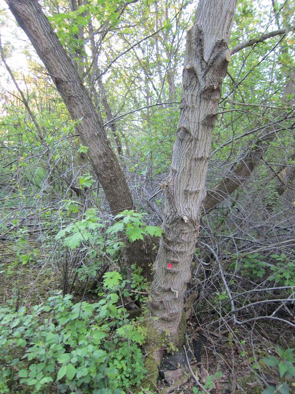 Ein todgeweihter Baum, als Todeskandidat durch den roten Punkt gekennzeichnet, hat offenbar ein Gnadengesuch gestellt, das sogar erhört wurde - Wie schön, dass es diesen Baum noch gibt! |