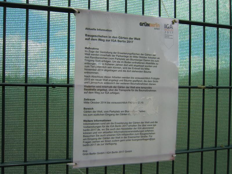 IGA Berlin Gmbh-Information, diesmal nicht an die "lieben Anwohner" gerichtet. Es handelt sich um eine "aktuelle" Information ohne Datumsangabe zum "Baugeschehen in den Gärten der Welt auf dem Weg zur IGA Berlin 2017" In den Randbereichen der Gärten der Welt werden im Zuge ihrer Erweiterung Arbeiten erfolgen. Anmerkung: Bei dieser Logik müsste der ganze Kienberg abgetragen werden. Gegen diesen ist der Erdwall hinterm Zaun Pipifax. Dort sollen sogar Bauarbeiter und später zahlende Gäste den gefährlichen Stoffen ausgesetzt werden. Bis zum Frühjahr soll dann ein neuer Wall angelegt werden. Und es werden Bäume geplanzt, die dem Sicht- und Lärmschutz dienen. Anmerkung: Bis zur IGA Berlin 2017 werden die Bäume noch nicht groß genug sein, um ernsthaft als Lärmschutz fungieren zu können. Hinter dem Wall wird tagtäglich von morgens bis abends die Umgebung und die Anwohner beschallt werden, die sich dagegen offenbar nicht wehren können. Denn hinterm Zaun ist die Bühne geplant Hinter dem Wall wird auch die Anlage einer Baustraße versprochen, die als Transportweg für die IGA-Maßnahmen dienen soll. Von Mitte Oktober 2014 bis zum Frühjahr 2015 sollen diese Planungen verwirklicht werden. [Anmerkung: Jetzt schreiben wir den Monat Mai 2015] Hingewiesen wird u.a. für weitere Informationen auf die IGA-Informationsveranstaltungen. Unterschrieben von: "Ihre Grün Berlin GmbH / IGA Berlin GmbH" |