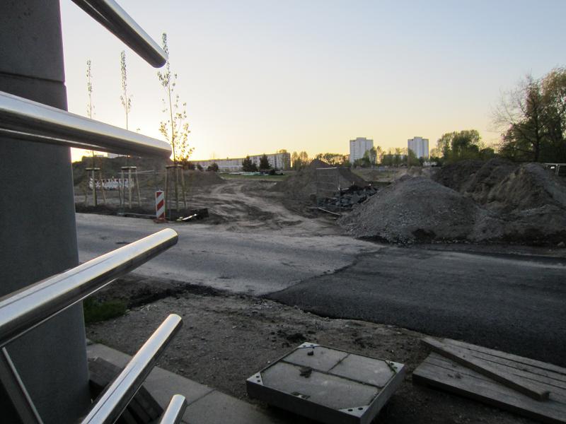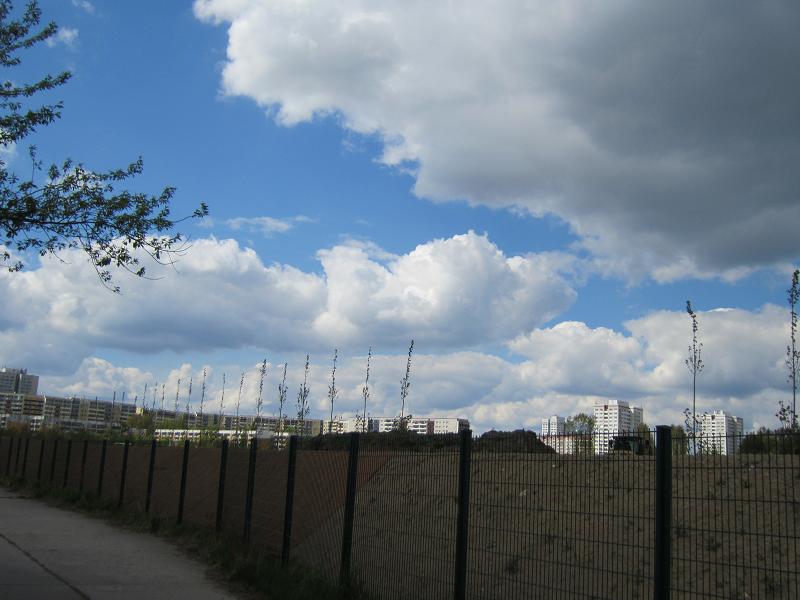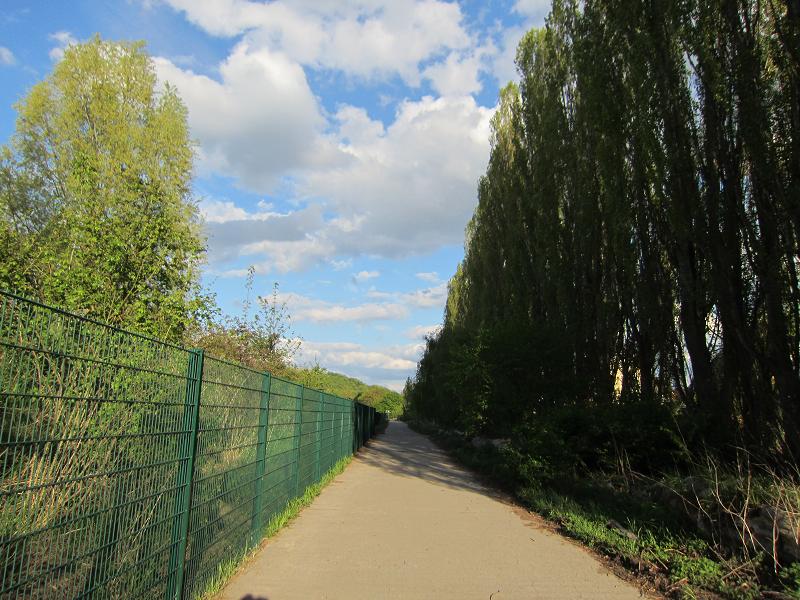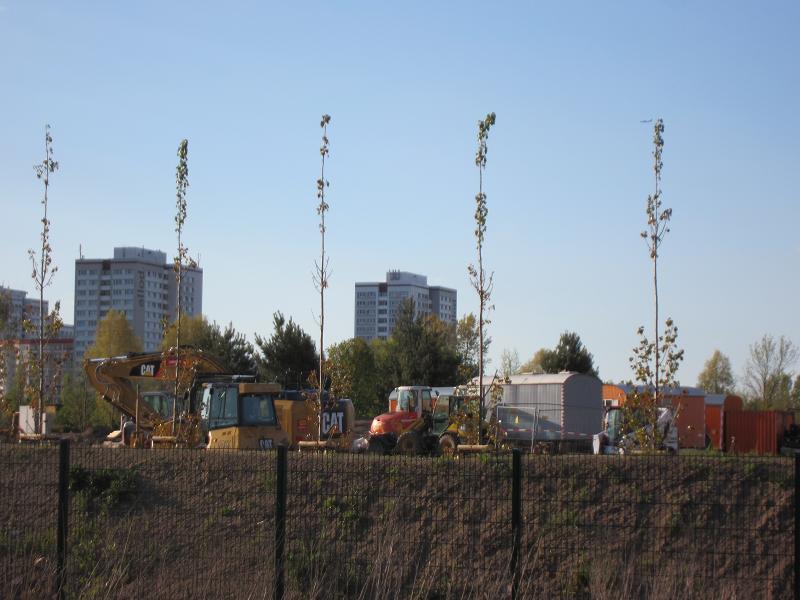 Echter Schallschutz - allerdings könnte eine einzige Baumreihe gegen die stundenlange Beschallung zu wenig sein... Im Hintergrund der Kienberg, links die Gärten der Welt |