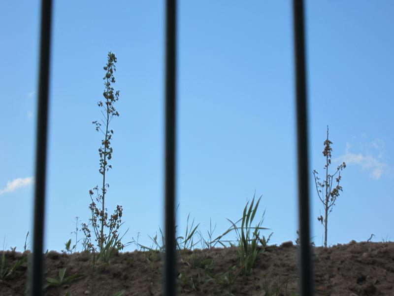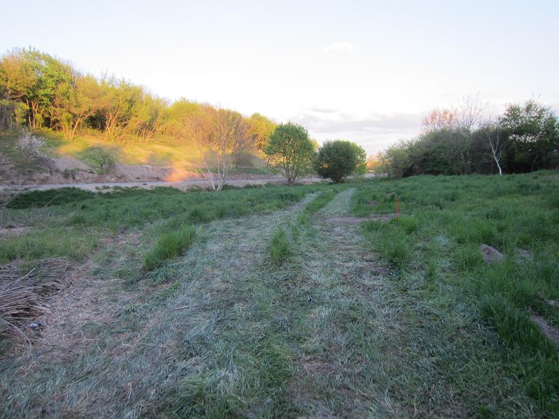 Der kahle Boden des Erdwalls begrünt sich wieder mit Wildpflanzen |