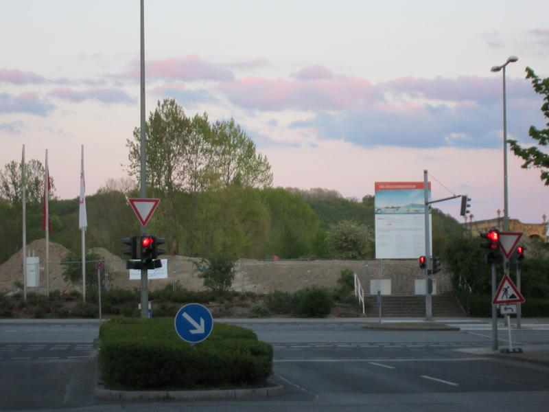 Die beiden Bauzaunelemente wirken wie ein Tor, das einladend für einen Spaziergang auf den Kienberg offensteht. Dieser Weg war früher eine kurze Verbindung zur Eisenacher Straße, dem derzeitigen Haupteingang zu den Gärten der Welt |