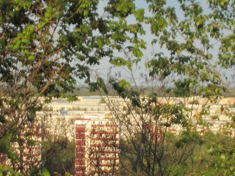 Blick auf die Plattenbauten hinterm Wuhletal |