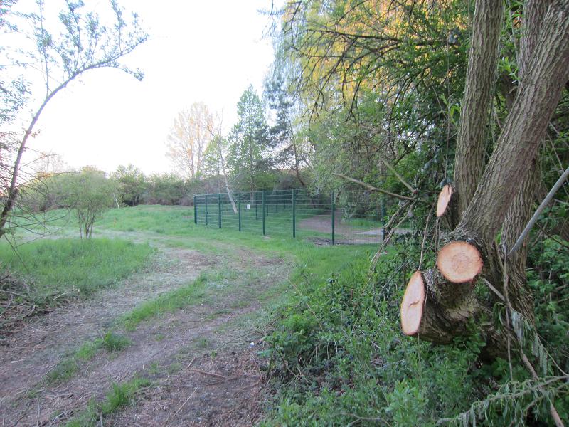 Die dichte Hecke, die das Kleingartengelände vom Wuhletal abgegrenzt und als Sichtschutz gedient hat, ist verschwunden |