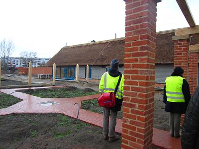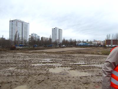 Wir wateten mutig weiter durch die Matschepampe, die mit zum Zeitstress der Planungsumsetzungen wegen der Vermeidung der Verdichtung des Bodens durch schwere Maschinen beiträgt, die nun nicht fahren können, zur Grube für das zukünftige Eingangsgebäude am Blumberger Damm. "Bleibt der Parkplatz?" interessierte jemanden. "Jede IGA braucht eine Blumenhalle. Das weiß jeder", wurde ihm erklärt. "Hier bauen wir eine Blumenhalle, die aber nach der IGA zu einem Parkhaus zurückgebaut wird."