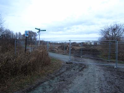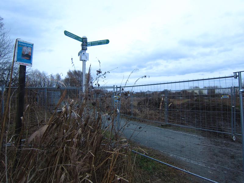 Dieser Weg wurde zur Sackgasse. An seinem Ende stand nicht nur der Bauzaun, der den Biesdorf-Marzahner-Grenzgraben, der bald auf der anderen Seite, also an den Kleingärten entlang, wieder geöffnet werden soll, damit das Galerie-Café aus dem Wuhletal wieder erreichbar ist. Aber was ist das denn? Gegenüber sperrte noch ein Zaun Teile des Wuhletals ab. Dieser Teil nennt sich Schermaussee - eine geschützte Landschaft, wohinein laut Reifenspuren mit Baufahrzeugen gefahren wird.
