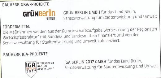 Der interessierte Leser erfährt auch, wer die Bauherren der IGA 2017 Berlin sind: Die mit GRW-Mitteln (Bundes- und Landesmittel) finanzierten Maßnahmen werden von der aus öffentlichen Mitteln finanzierten Grün Berlin GmbH als "Gemeinschaftsaufgabe zur Verbesserung der regionalen Infrastruktur" umgesetzt, wobei die Senatsverwaltung für Stadtentwicklung und Umwelt des finanziell klammen Berlins, wenn es um soziale und andere für die Bürger wichtige Projekte geht, kofinanziert. Bauherr für die IGA-Projekte ist die 100 prozentige Tochter der Grün Berlin GmbH, die IGA Berlin 2017 GmbH, deren Geschäftsführer hier wie dort Christoph Schmidt ist. Wer sieht in solch genialen Strukturen ein Geldkarussel, das wie ein Strudel unsere Steuergelder verschlingt?