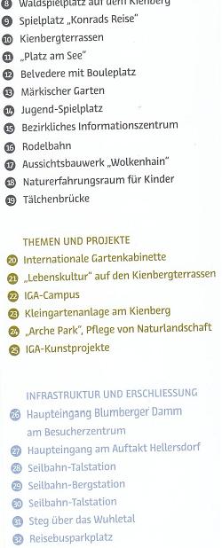 Im einzelnen handelt es sich außerhalb der heutigen Gärten der Welt laut Flyer um folgende Bauwerke / Eingriffe in das Kienberg-Wuhletal-Gebiet und den Jelena-Santic-Friedenspark.