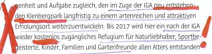 Und zwar gilt diese Infopapier-Aussage für alle Erweiterungsflächen außerhalb der Gärten der Welt, also Kienberg, Wuhletal und Jelena-Santic-Friedenspark, dessen Name in einer uns ungewohnten und darum interessanten Schreibweise dargeboten wird. Exotisch eben - wie sicherlich auch diese Gartenschau ganz Blümchenschau-like daherkommen sollte. Es wird nicht das kleinste Hüsteln ausgelassen, um das IGA 2017 Berlin-Vorhaben in einem bestehenden, ökologisch wertvollen Landschafts- und Naturgebiet aufzuwerten und Menschen von der Frevelhaftigkeit dieses Vorhabens abzulenken, sondern dafür zu begeistern.