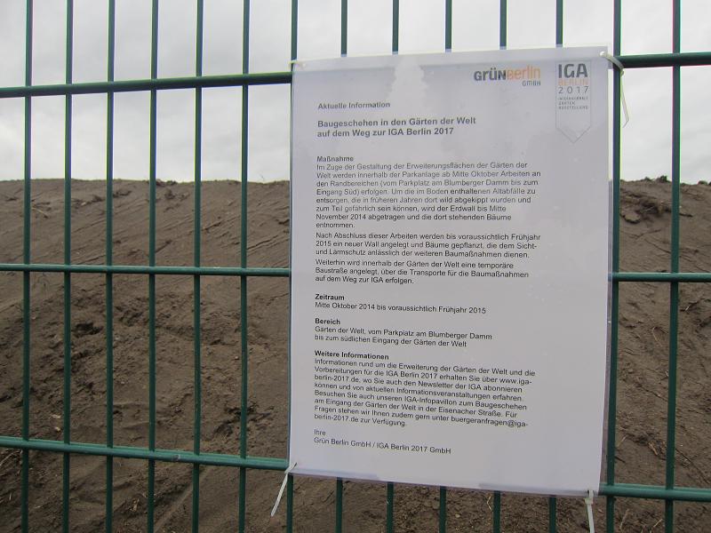 Eine DIN A4-Seite informiert Spaziergänger über das Baugeschehen zur IGA 2017 Berlin in den Gärten der Welt. - Alles wird schön! Quicklebendige Naturkinder werden massakriert und durch hübsche Puppen ersetzt. DIESE sollen bestaunt werden!