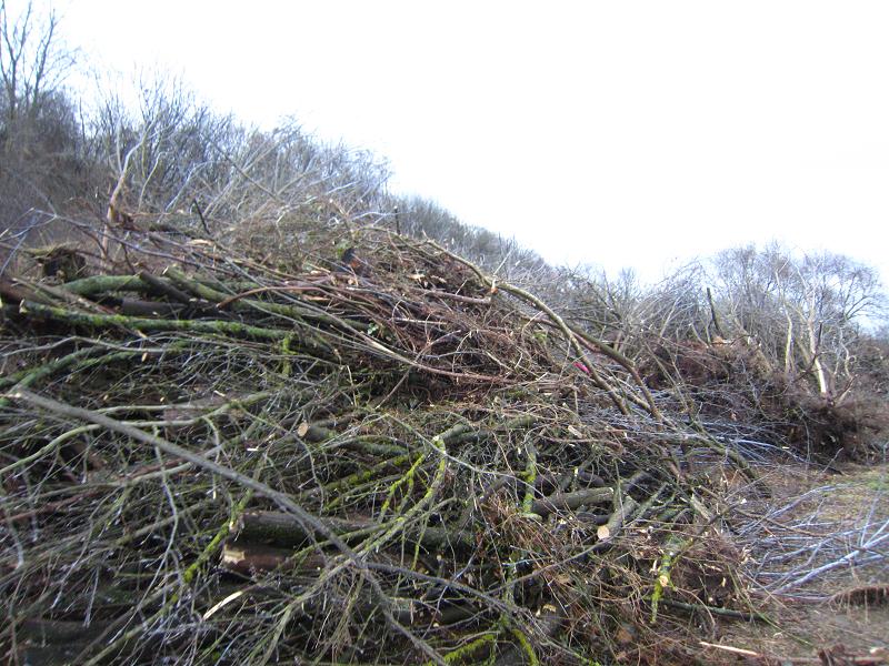 Den Kienberg, durch dessen verschiedene Apfelsorten ich im Herbst mich noch durchgekostet hatte, konnte ich kaum anschauen. Wo ist hier die Pflanzenfülle abgeblieben? Auf den Holzhaufen, die fein säuberlich aufgestapelt gelegentlich den Weg säumten. - Das gehört zum WaldENTWICKLUNGSkonzept. Ja, die heimischen Gehölze sollen stehenbleiben! Da klang ein Ehrenwort mit durch. Nur, die Obstbäume wurden durch andere Gehölze bedrängt und viele sind auch krank. Ich hörte eine ganz große Einschränkung für den Erhalt der Obstbäume und anderer heimischen Gehölze heraus. Man versucht, durch Schnittmaßnahmen einige alte Obstbäume zu retten. Hier soll ja schließlich eine Streuobstwiese angelegt werden - und da passen die Obstbäume hinein. Und auch Wein soll hier angebaut werden; denn das sind die zukünftigen Kienberg-Terrassen.