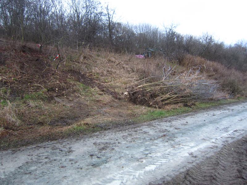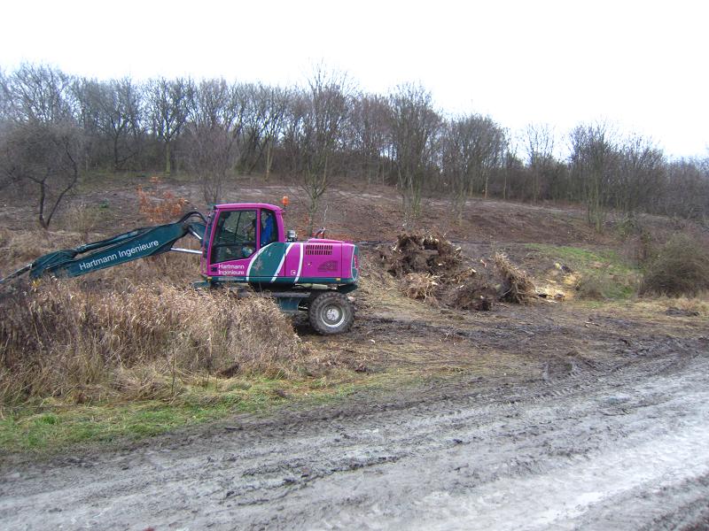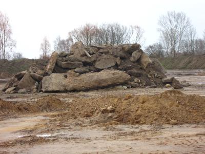 Ein urig aussehender Berg aus Quasi-Felsbrocken neben Erdaufschüttungen zog unsere Aufmerksamkeit auf sich. Das sind die Hinterlassenschaften von der Suche nach Schadmaterial. "Bleibt der Berg? Hier könnte der Steinschmätzer brüten!" wurde angemerkt. Und auch felsbewohnende Insekten, fiel mir ein. Dieses Kleinstmassiv könnte sich zum wundervollen Lebensraum entwickeln... Nein, der Berg bleibt nicht. Jetzt im Winter erfolgen die meisten Arbeiten, weil dann einem der Tierschutz nicht im Wege steht. Die Beton- und Steinsbrocken werden geschreddert und verbleiben als Wegebelag auf dem Gelände.