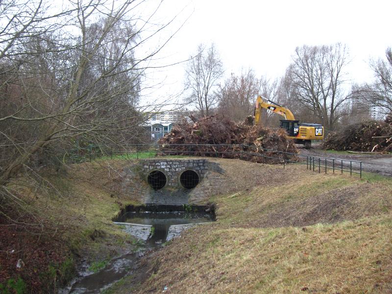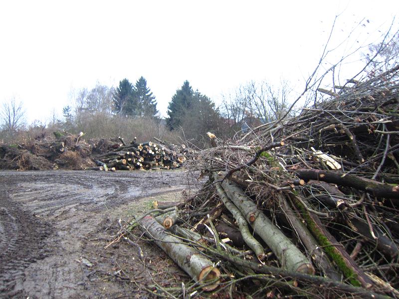 Der Weg zwischen Kienberg-Südfuß und Biesdorf-Marzahner-Grenzgraben durchs Wuhletal von der Seite des Berliner Bezirksteils Marzahn aus nach seinem Schwesternteil Hellersdorf ist durch einen Bauzaun gesperrt. Wo wochenlang der zum Himmel stinkende Grashaufen lag, haben nun gerodete Baumteile ihren Platz gefunden. Diese werden nicht zur phantasievollen Anlage und für Gartenfreunde beispielhaften Lösungen für neue Lebensräume verwendet, die unzähligen Rote Liste- und vom Aussterben bedrohten Pflanzen, Pilzen und Tieren einen Lebensraum bieten würden, sondern abtransportiert mit vielleicht thermischer Verwertung, also Verbrennung. - Alles wird schön! Quicklebendige Naturkinder werden massakriert und durch hübsche Puppen ersetzt. DIESE sollen bestaunt werden!