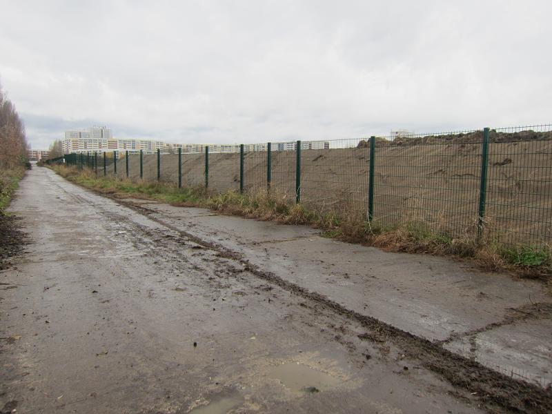 Der bis vor der Rodung mit Bäumen bepflanzte und nun unbepflanzte Erdwall säumt den Zaun an der Südseite der Gärten der Welt. Die Anliegerstraße wird als Baustraße genutzt, verschmutzt und verlärmt. - Alles wird schön! Quicklebendige Naturkinder werden massakriert und durch hübsche Puppen ersetzt. DIESE sollen bestaunt werden!