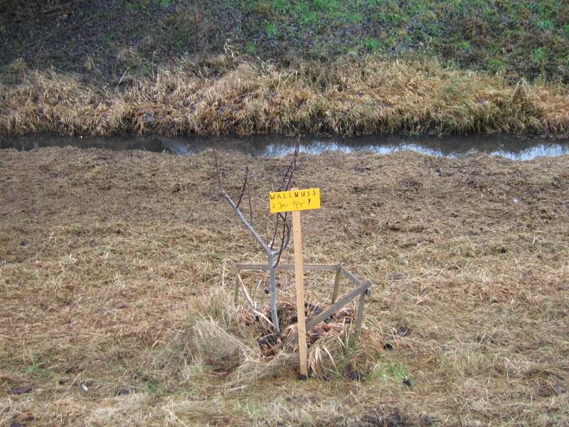 Eine junge Walnuss am Biesdorf-Marzahner-Grenzgraben wurde schützend von Unbekannt umstellt und mit einem Pflegehinweis versehen.