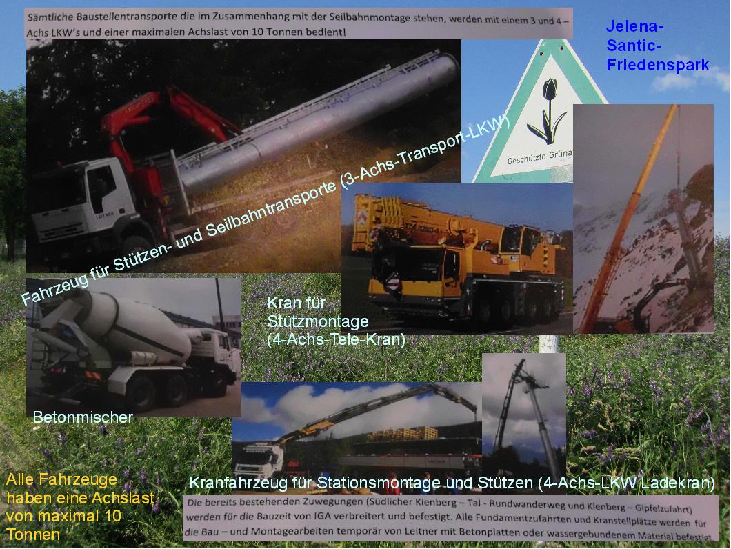 Das Material wird nicht mit Hubschraubern auf den Kienberg gebracht, sondern mit schweren Maschinen, die nicht mehr als 10 Tonnen, also stolze 10.000 Kilogramm. Diese schweben nicht über dem Boden, sondern verdichten ihn ungeheuerlich. Die bestehenden Wege reichen für diese Fahrzeugmonster nicht aus, sondern werden verbreitert. Da die Bäume bis dicht an den jetzigen Wegen stehen, müssen sie weichen. Also werden 30jährige Bäume vernichtet, in denen viele Tiere, vor allem Insekten und Vögel ihre Heimstatt gefunden haben. Die den Aufbau der Seilbahnstützen störenden Bäume werden zurückgeschnitten. Das Ganze findet in den Grenzen der Baufreiheit statt, also in einem größeren Radius um die Stützen, der nicht angegeben wird. Bei den großen Maschinen kann man sich auch eine entsprechend benötigte Fläche vorstellen. Da 10 Stützen aufgestellt werden, wird das Wuhletal auf jeden Fall in Mitleidenschaft gezogen. Die Zeichnungen sind nicht selbsterklärend, und ich finde keine Legende. Den Trassenverlauf kann ich nicht genau erkennen. Sicher bin ich nur, dass mindestens eine Stütze mitten ins Wuhletal gebaut wird.
