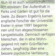 Wir Menschen brauchen Grün. (vgl. Anlage: Ergebnisse einer Studie - "Grün ist gesund" aus wohnen-magazin 2. Quartal 2014 Seite 8).