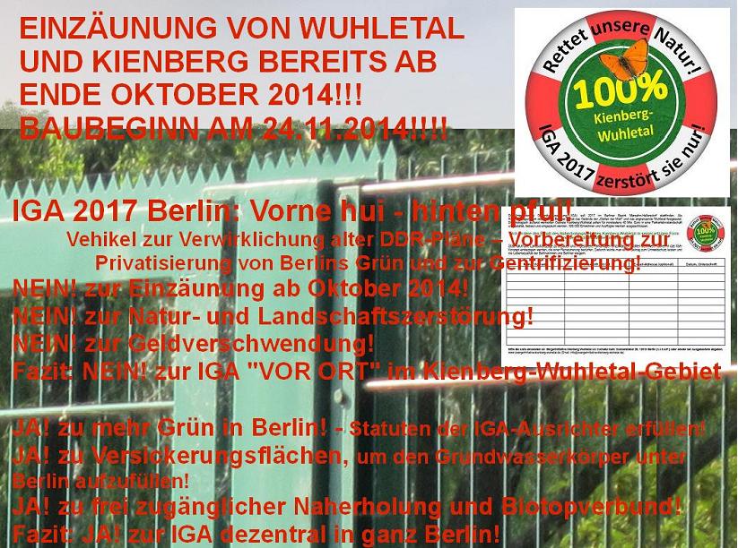 Obwohl die IGA Berlin 2017 GmbH die großflächige Einzäunung erst für das Frühjahr 2015 angekündigt hat, wird diese nun ein halbes Jahr vorgezogen, und ab Oktober 2014 werden Kienberg und Wuhletal eingezäunt und nicht mehr frei zugänglich sein. Der Baubeginn wird den Marzahn-Hellersdorfer Anwohnerinnen und Anwohnern als Weihnachtsüberraschung präsentiert: Er startet am 24. November 2014.