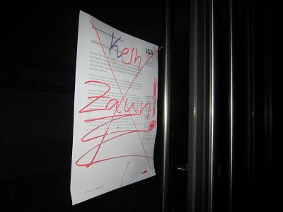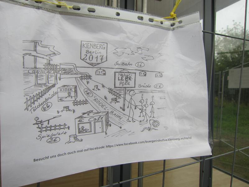 Die Bürgerinitiative Kienberg-Wuhletal schlägt ihre Vorstellung von der IGA 2017 Berlin nach den ihr bekannten Plänen der IGA Berlin 2017 GmbH zum Waldumbau auf dem Kienberg an den Bauzaun an: Stadt dichtem Baumbestand schmücken den Kienberg nun Baumstubben und Attraktionen wie