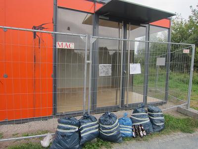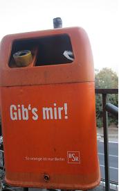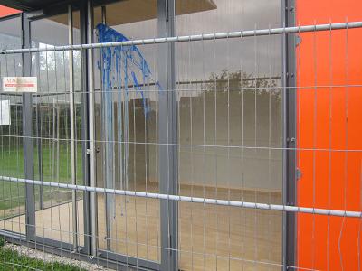Blaue Plastiksäcke, gefüllt mit Müll aus dem IGA 2017 Berlin-Gelände, als Protestaktion gegen die IGA Berlin 2017 GmbH, die ihre Aufgaben nicht ordentlich erfüllt. - Der orange Info-Pavillon wird bunter und "schmückt" sich nun auch mit schwarzer Farbe. Graffitti ist das nicht. |