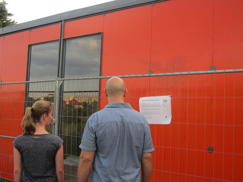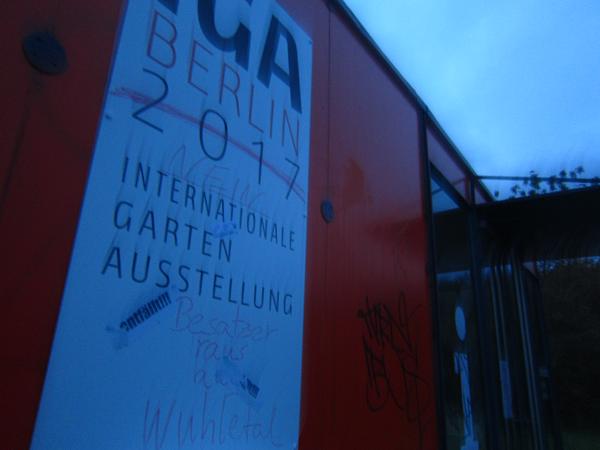 Ein blauer Protestgruß "ziert" die IGA-Infobox. Haben Bürger trotz schillernder und blendender Schönfärberei zur Entwicklung des Kienberg-Wuhletal-Areals eine andere Meinung als die IGA Berlin 2017 GmbH selbst? |