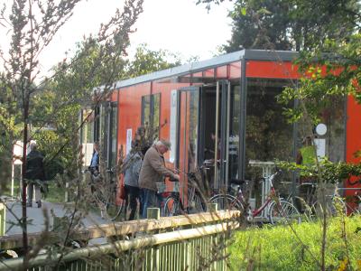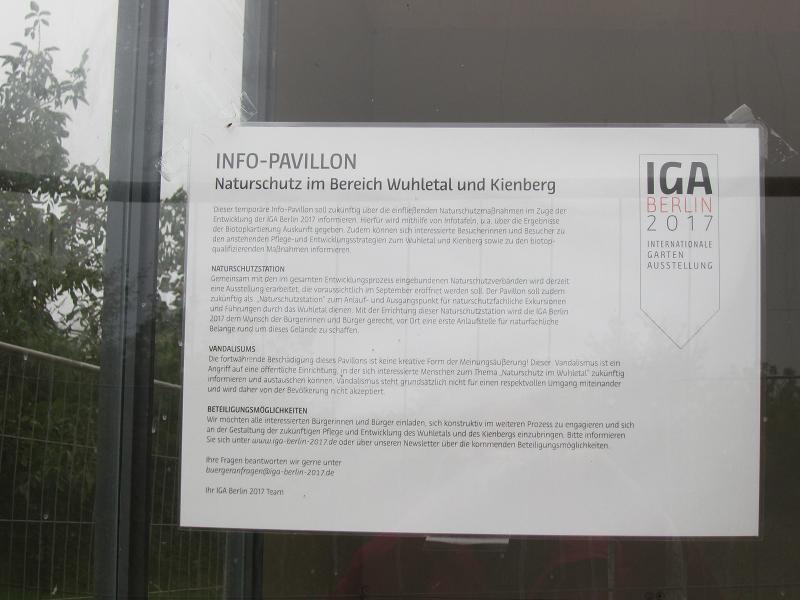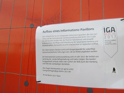 Die IGA Berlin 2017 GmbH hat mitten ins Wuhletal eine leuchtend orangefarbene Infobox gebaut, um Anwohner und Ausflügler über ihre schillernden Absichtserklärungen zu informieren. Wie schön alles wird und wie SIE junge Menschen an die Natur heranführt. Von den konkret ergriffenen und zu ergreifenden Maßnahmen erfahren die Bürgerinnen und Bürger so gut wie nichts. Ausschreibungen verschwinden schnell aus dem Internet, Ausstellungen zu Siegerentwürfen dauern nur eine gute Woche von 9-18 Uhr außer sonntags. Nur ein Sonnabend ist dabei; die arbeitende Bevölkerung wird quasi von den "tollen" Darstellungen, die im gewohnten Stil der abweisenden, langweiligen, nichtssagenden Moderne daherkommt, ausgeschlossen.