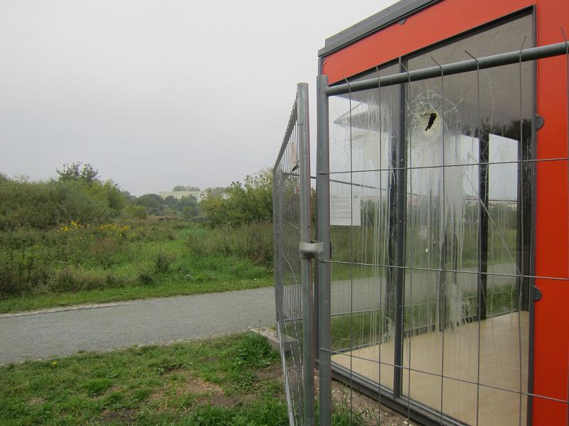 Ein Monat ist vergangen, und nun bin ich wieder in Hellersdorf. Zu meiner Freude ist noch kein Zaun zu sehen und ich kann die schönen Wege durch das Wuhletal genießen. Ich komme auch an der IGA-Infobox vorbei. Sind die Scheiben wieder eingeworfen? Zu meiner Beruhigung und Freude sind sie ganz! Allerdings lese ich die eine oder andere Botschaft: