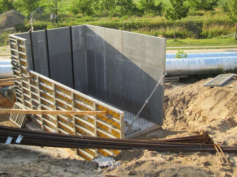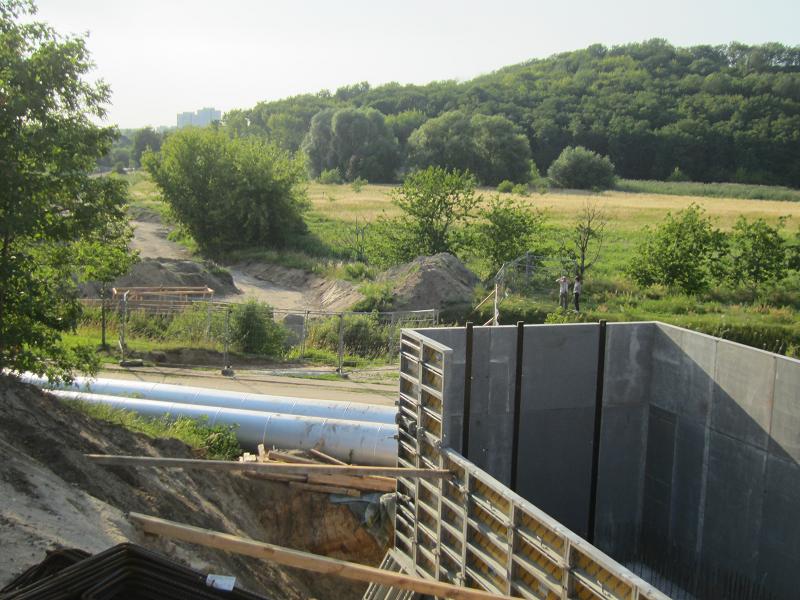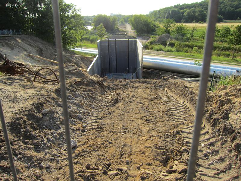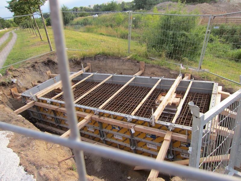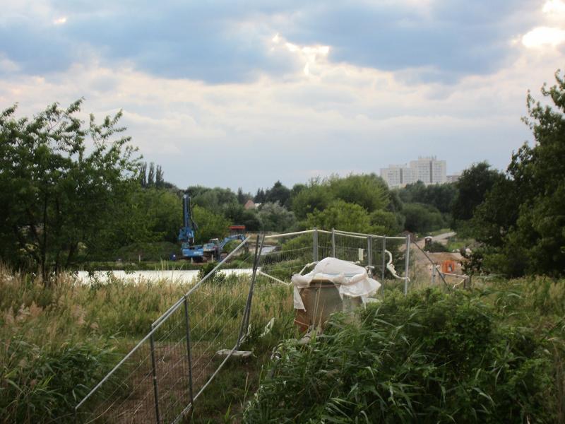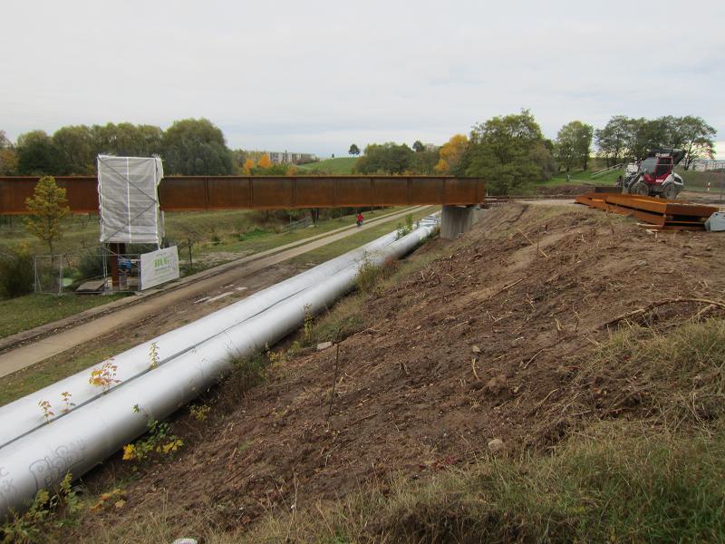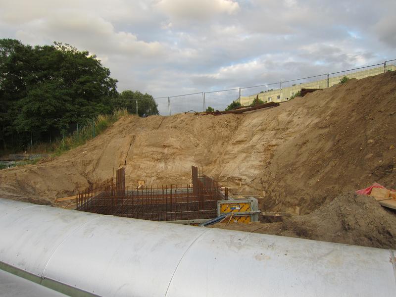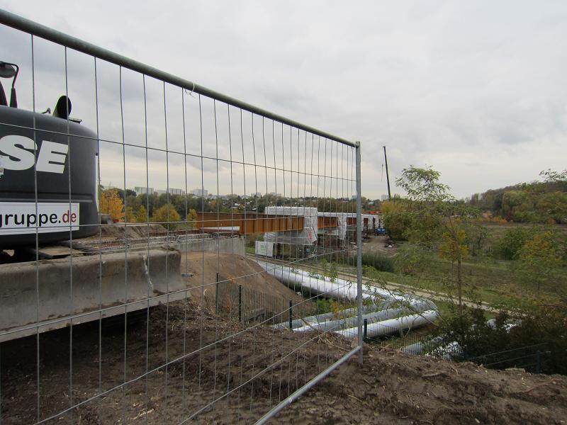 Hinter den Fernwärmerohren gibt es eine neue Pfahlgründung für die das Wuhletal überspannende Brücke, "Wuhlesteg" genannt |