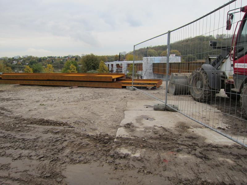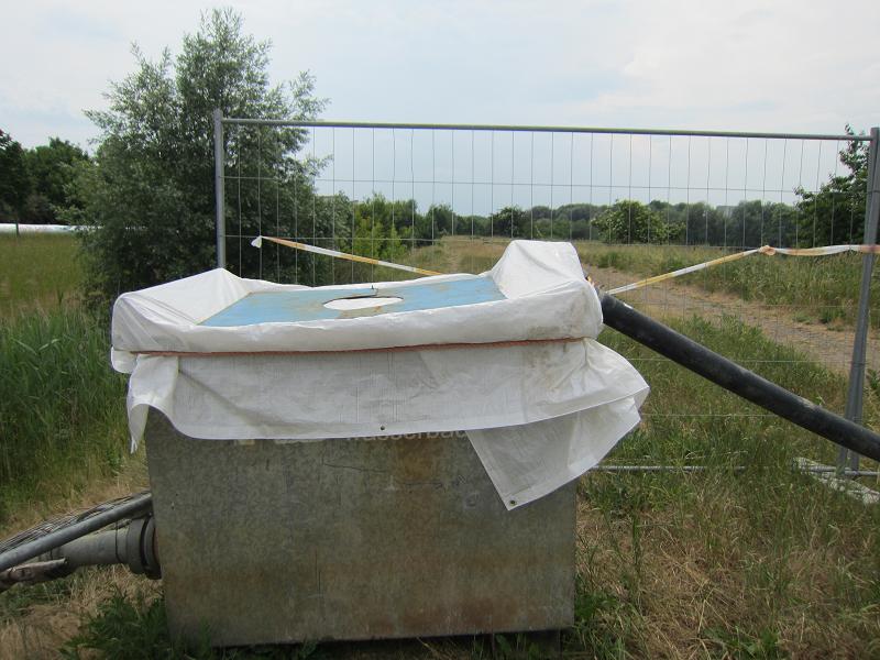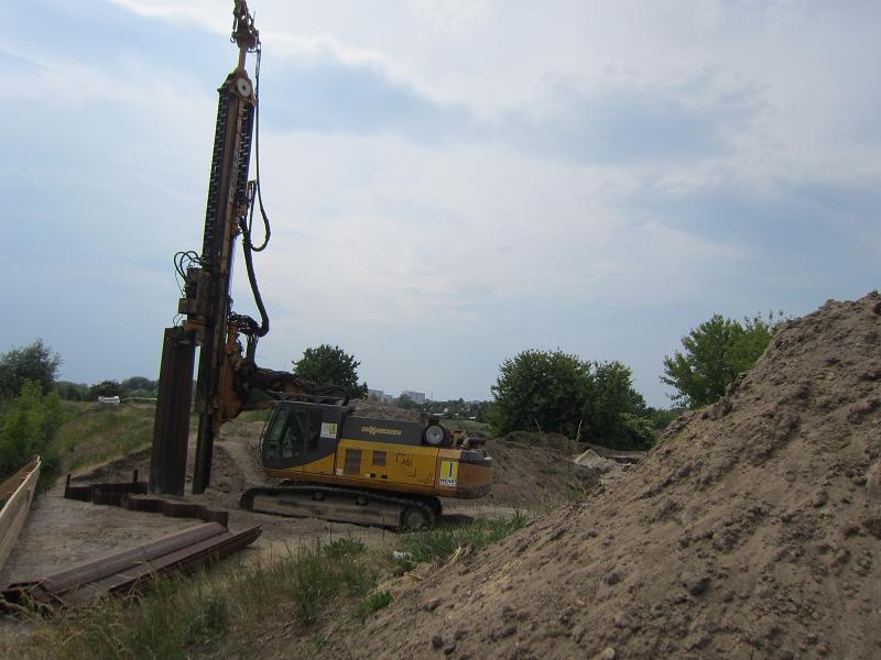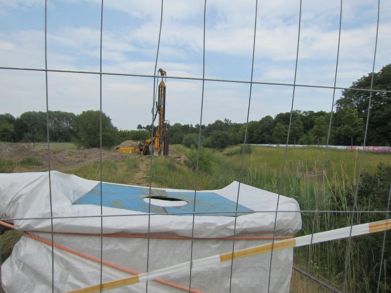 Eine Pfahlgründung direkt neben dem Betonweg, der nicht eingezäunt werden darf, neben den Fernwärmerohren von Vattenfall. |
