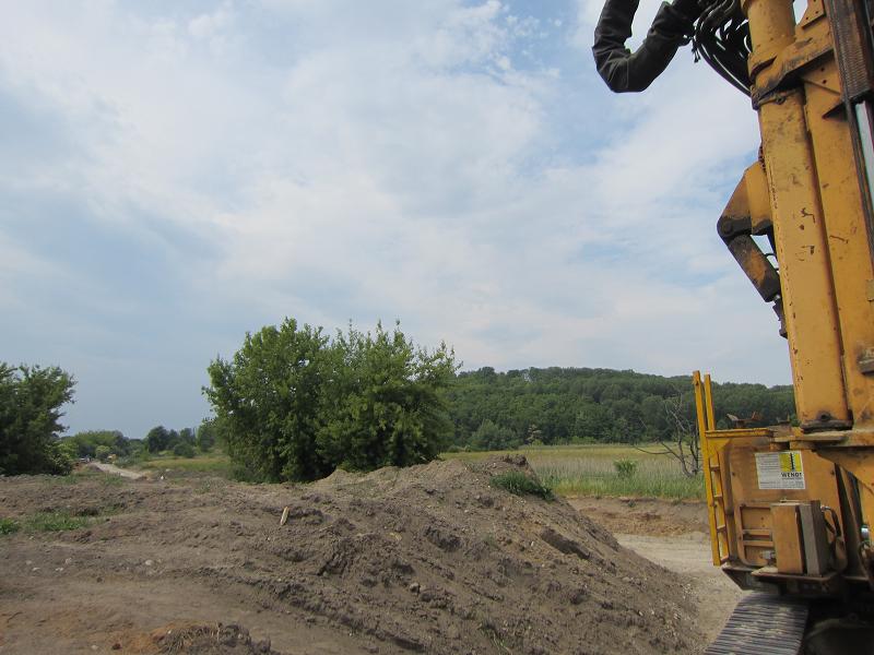 Im Vordergrund mit der Abdeckung steht das Abpumpgerät, welches für die Trockenlegung des Wuhletals sorgt. Hinter den Baggern liegt der Wuhleteich. |
