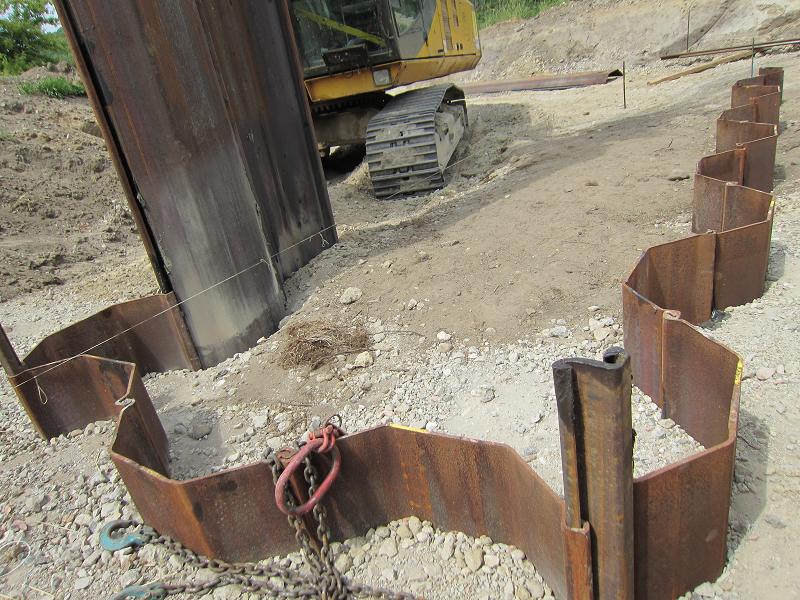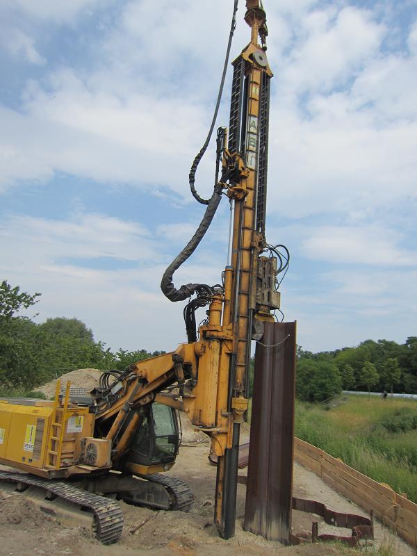 Schon 10 Meter tief eingebrachte Spundwände neben einer, die noch unvollständig in den Boden gerammt ist |