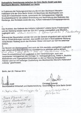 In Ergänzung der Nutzungsvereinbarung, die mit dem Bezirksamt Marzahn-Hellersdorf und der Grün Berlin GmbH mit Beschluss des Bezirksamtes vom 18.2.2014 beschlossen wurde, vereinbaren die Vertragsparteien folgende Grundsatzklausel für die weitere Entwicklung und Nachnutzung des Geländes des Kienbergs, des Wuhletals sowie des sogenannten Auftakt Hellersdorf / Vertragsgegenstands.