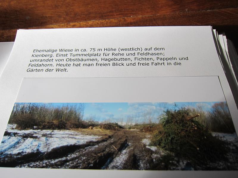 Ehemalige Wiese in circa 75 Meter Höhe (westlich) auf dem Kienberg. Einst Tummelplatz für Rehe und Feldhasen; umrandet won Obstbäumen, Wildrosen mit Hagebutten, Fichten, Pappeln und Feldahorn. Heute hat man freien Blick auf und freie Fahrt in die Gärten der Welt. |
