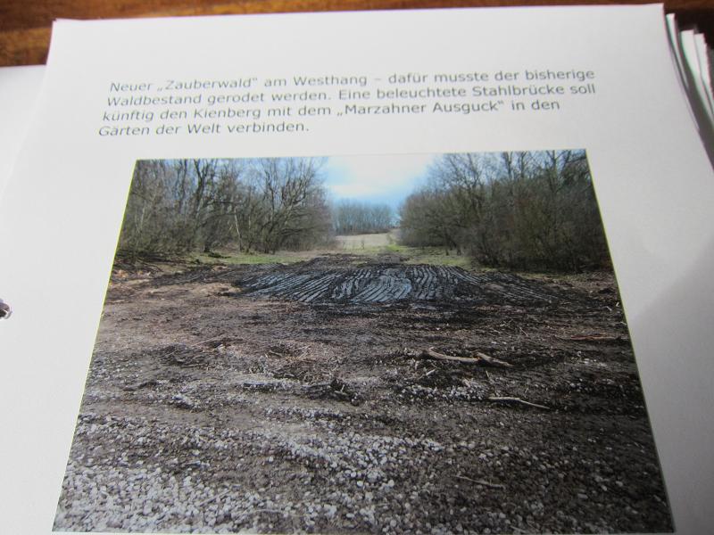 Neuer "Zauberwald" am Westhang - dafür musste der bisherige Waldbestand gerodet werden. Eine beleuchtete Stahlbrücke soll künftig den Kienberg mit dem "Marzahner Ausguck" in die Gärten der Welt verbinden. |