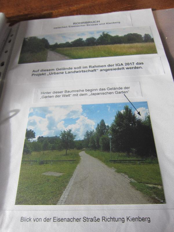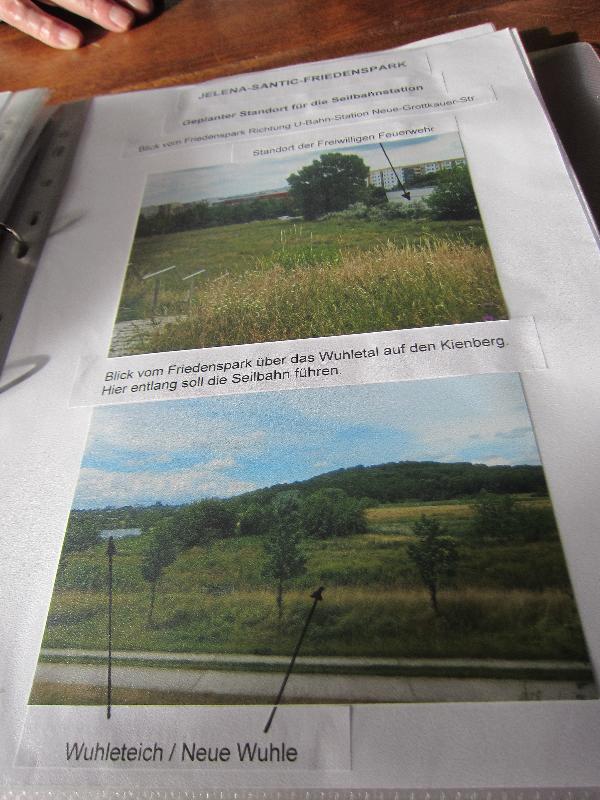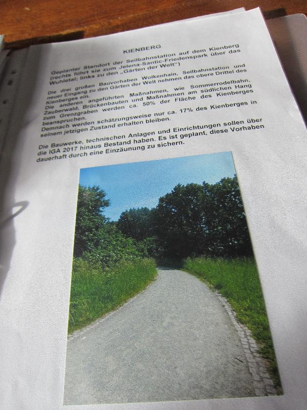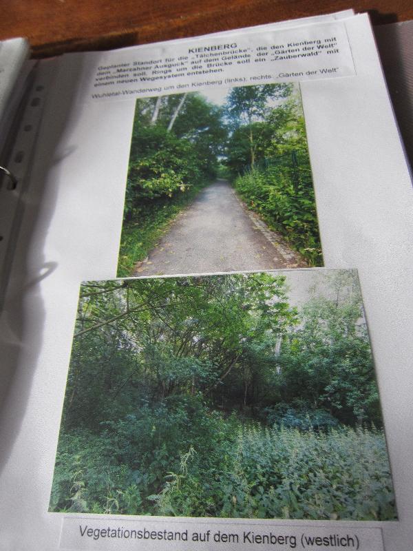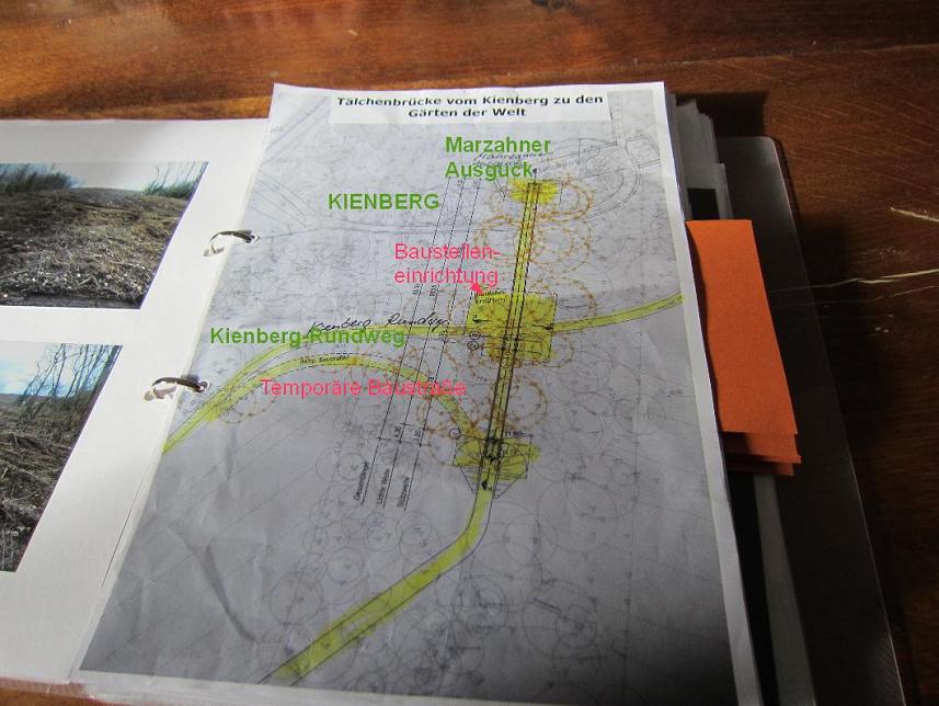 Kienberg Geplanter Standort der Seilbahnstation auf dem Kienberg (rechts führt sie zum Jelena-Santic-Friedenspark über das Wuhletal; links zu den "Gärten der Welt"). Die drei großen Bauvorhaben Wolkenhain, Seilbahnstation und neuer Eingang zu den Gärten der Welt nehmen das obere Drittel des Kienbergs ein. Die anderen angeführten Maßnahmen wie Sommerrodelbahn, Zauberwald, Brückenbauten und Maßnahmen am südlichen Hang zum Biesdorf-Marzahner-Grenzgraben werden circa 50 Prozent der Fläche des Kienbergs beanspruchen. Demnach werden schätzungsweise nur circa 17 Prozent des Kienbergs in seinem jetzigen Zustand erhalten bleiben. Die Bauwerke, technischen Anlagen und Einrichtungen sollen über die IGA Berlin 2017 hinaus Bestand haben. Es ist geplant, diese Vorhaben dauerhaft durch eine Einzäunung zu sichern. |