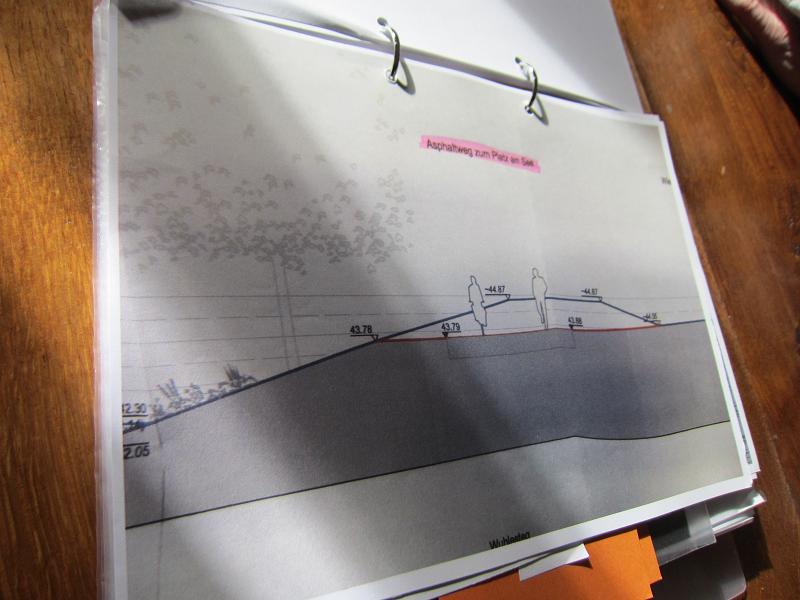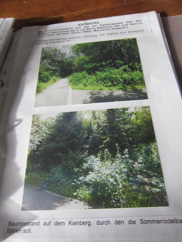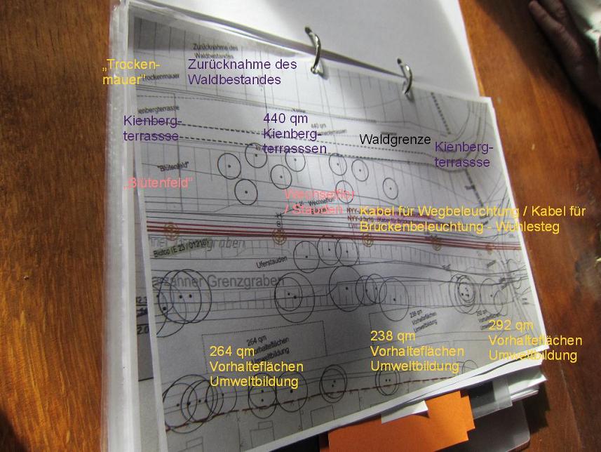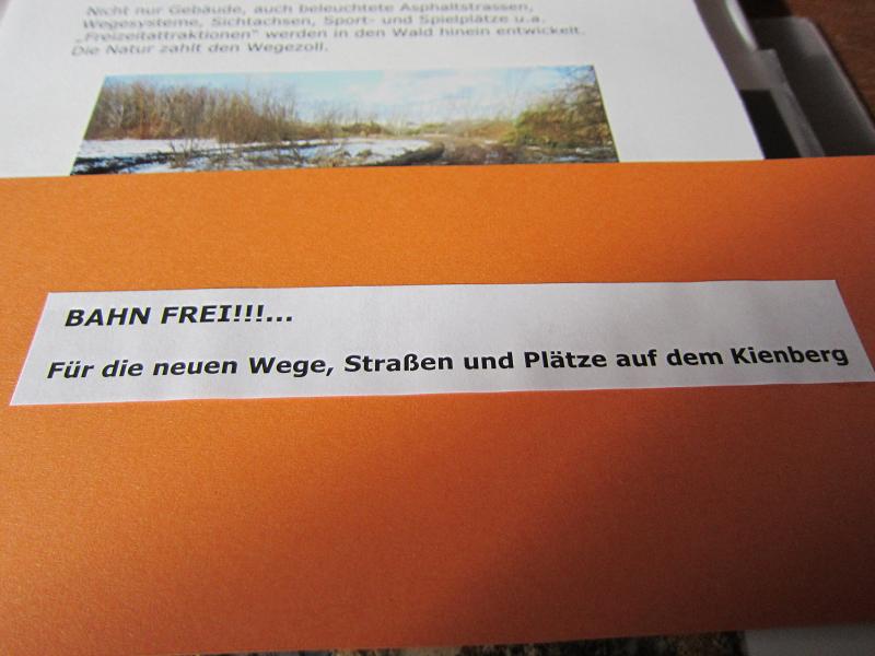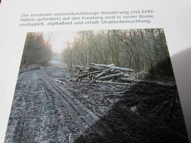 Der einstmals wasserdurchlässige (unversiegelte) Wanderweg (mit EFRE-Mitteln gefördert) auf dem Kienberg wird in seiner Breite verdoppelt, asphaltiert und erhält Strassenbeleuchtung |