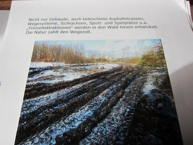 Nicht nur Gebäude, auch beleuchtete Asphaltstraßen, Wegesysteme, Sichtachsen, Sport- und Spielplätze u.a.sowie "Freizeitaktivitäten" werden in den Wald hinein entwickelt. Die Natur zahlt den Wegezoll. |