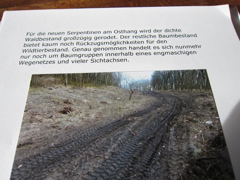 Für die neuen Serpentinen am Osthang wird der dichte Waldbestand großzügig gerodet. Der restliche Baumbestand bietet kaum noch Rückzugsmöglichkeiten für den Wildtierbestand. Genau genommen handelt es sich nunmehr nur noch um Baumgruppen innerhalb eines engmaschigen Wegenetzes und vieler Sichtachsen [sogenannte "Waldbilder"]. |