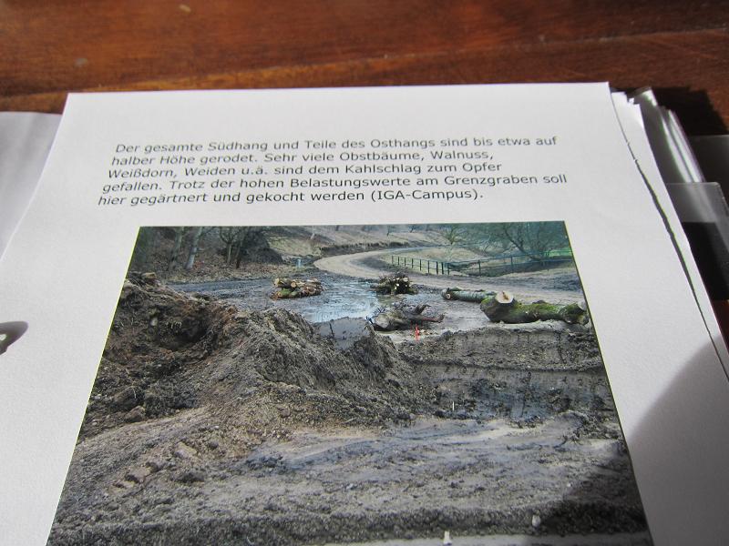 Der gesamte Südhang des Kienbergs und Teile des Osthangs sind bis etwa auf halber Höhe gerodet. Sehr viele Obstbäume, Walnuss, Weißdorn, Weiden u.a. sind dem Kahlschlag zum Opfer gefallen. Trotz der hohen Belastungswerte am Biesdorf-Marzahner-Grenzgraben soll hier gegärtnert und gekocht werden (IGA-Campus). |