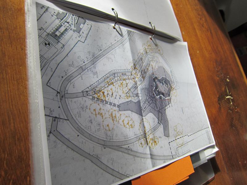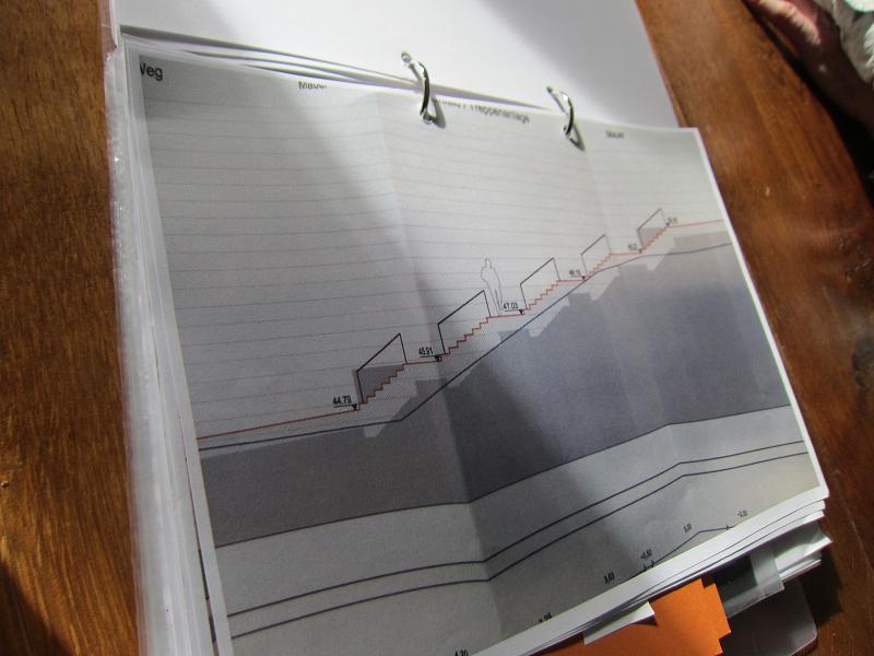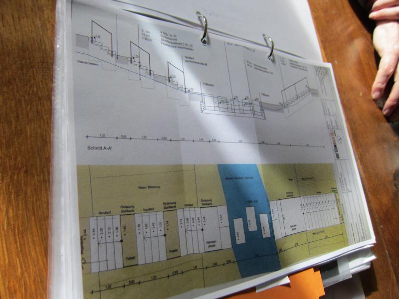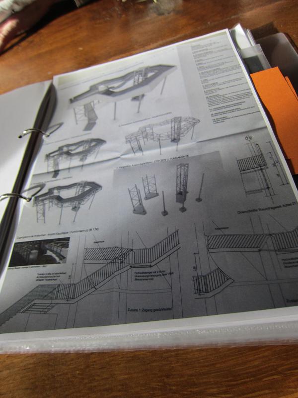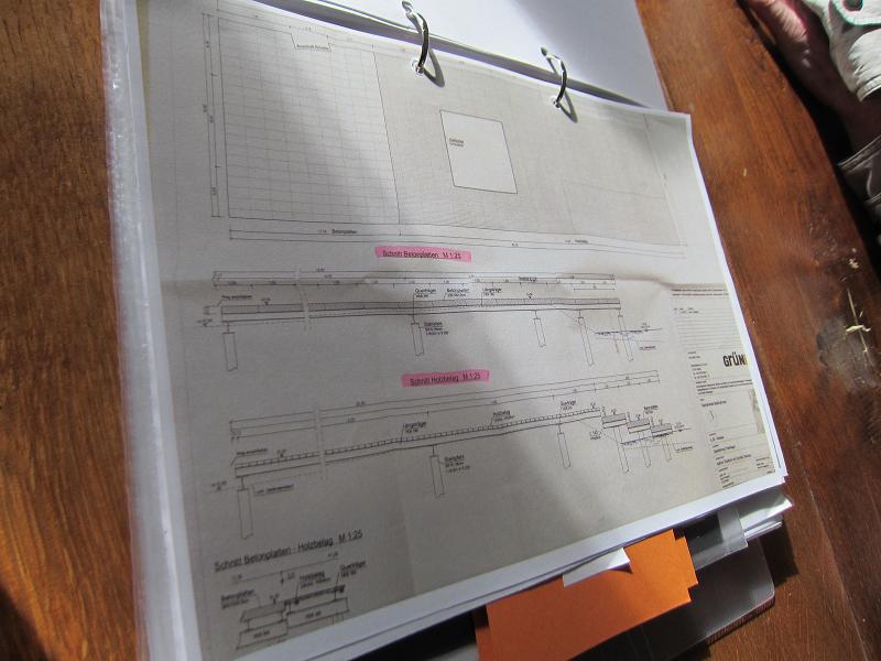 Rosa Markierung oben: Schnitt Betonplatten Maßstab 1:25 Rosa Markierung unten: Schnitt Holzbelag Maßstab 1:25 Stahlpfähle und Längsträger Stahl und Beton werden in das Naturgebiet in Unmengen eingetragen. Der Holzbelag suggeriert Naturnähe. |