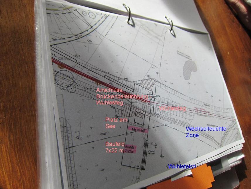 Wuhlesteg und Platz am See (Wuhleteich) [Quer durch die Schilffläche, die Brutplatz für die Vogelart Wachtelkönig (FFH-Art), die Rohrweihe und zahlreiche Wasservogelarten waren, wird der Steg (eigentlich eine Brücke) gebaut und behauptet, dass diese Maßnahme die Natur nicht beeinträchtigt.] |