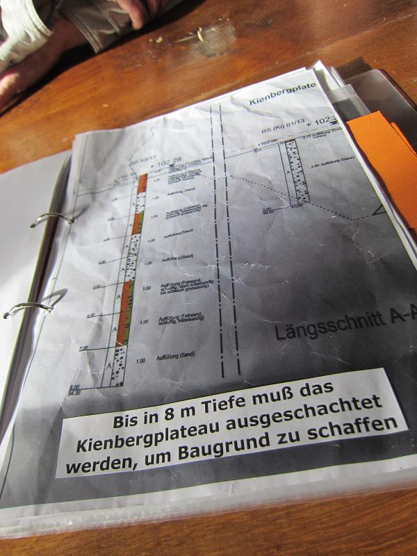Bis in 8 Meter Tiefe soll das Kienbergplateau ausgeschachtet werden, um Baugrund zu schaffen [Am linken und rechten Rand steht im wesentlichen: Auffüllung Sand bzw. Feinsand, auch schluffig bzw. humos] |