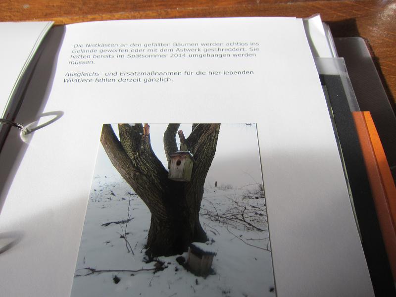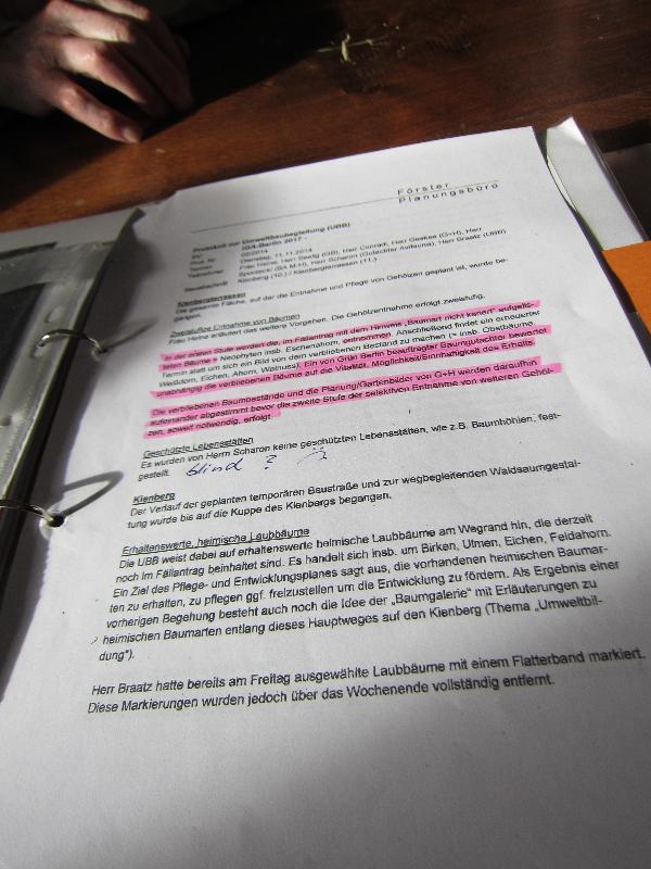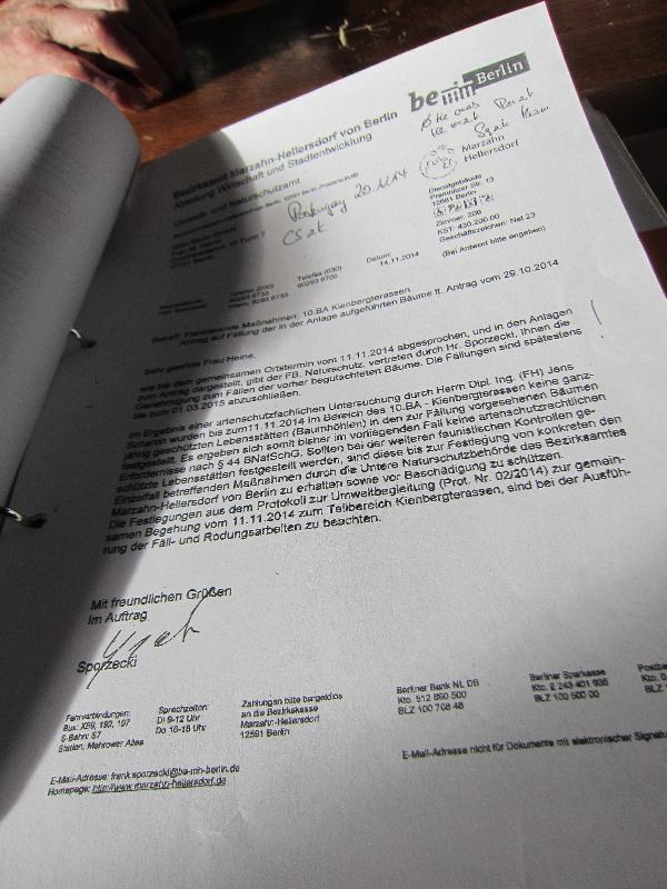 Schreiben des Umwelt- und Naturschutzamtes des Bezirksamtes Marzahn-Hellersdorf vom 14.11.2014 an die Grün Berlin GmbH, verfasst von Herrn Sporzecki Antrag auf Fällung der in der Anlage aufgeführten Bäume laut Antrag vom 29.10.2014 Sehr geehrte Frau Heine, wie bei dem gemeinsamen Ortstermin vom 11.11.2014 abgesprochen, und in den Anlagen zum Antrag dargestellt, gibt der FB Naturschutz, vertreten durch Herrn Spozecki, Ihnen die Genehmigung zum Fällen der vorher begutachteten Bäume. Die Fällungen sind spätestens bis zum 1.3.2015 abzuschließen. Artenschutzfachliche Untersuchungen wurden von Herrn Dipl. Ing (FH) Jens Scharon, [NABU Berlin], im Bereich des 10. BA Kienbergterrassen bis zum 11.11.2014 vorgenommen. Einer der obersten Naturschützer konnte keine ganzjährig geschützten Lebensstätten (Baumhöhlen) in den zur Fällung vorgesehenen Bäume feststellen. Somit ergeben sich in diesem Fall keine artenschutzrechtlichen Erfordernisse nach § BNatSchG (Bundesnaturschutzgesetz). Falls doch noch schützenswerte Lebensstätten festgestellt werden, sind diese vor Beschädigung zu schützen bzw. zu bewahren. |