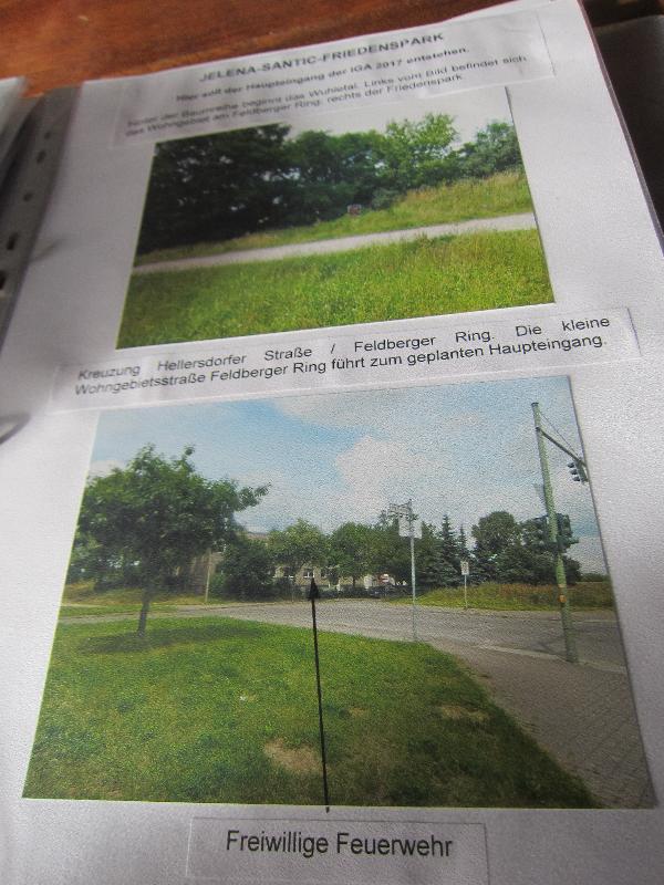 Jelena-Santic-Friedenspark - Haupteingang Hier soll der Haupteingang der IGA Berlin 2017 entstehen. Oberes Bild: Die hintere Baumreihe begrünt das Wuhletal. Links vom Bild befindet sich das Wohngebiet vom Feldberger Ring, rechts der Friedenspark. Unteres Bild: Kreuzung Hellersdorfer Straße / Feldberger Ring. Die kleine Wohngebietsstraße Feldberger Ring führt zum geplanten Haupteingang. Der Besucherstrom zieht am Standort der Freiwilligen Feuerwehr vorbei. Bei Alarm / Einsätzen könnte er sich als störend erweisen. |