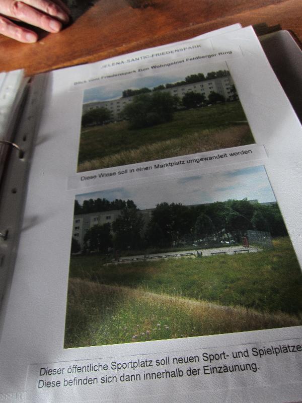Jelena-Santic-Friedenspark - Wegnahme des oeffentlichen Sport- und Spielplatzes zugunsten von Bezahl-Spielstätten Oberes Bild: Blick vom Friedenspark zum Wohngebiet Feldberger Ring Diese Wiese soll in einen Marktplatz umgewandelt werden. Unteres Bild: Dieser öffentliche Sportplatz soll neuen (Bezahl-)Sport- und Spielplätzen weichen. Diese befinden sich dann innerhalb der Einzäunung. |