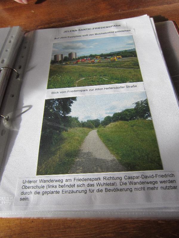 Jelena-Santic-Friedenspark - Aus dem Festplatz wird Busparkplatz Oberes Bild: Auf dem Festplatz soll der Busbahnhof entstehen. Blick vom Friedenspark zur Alten Hellersdorfer Straße Unteres Bild: Unterer Wanderweg am Friedenspark Richtung Caspar-David-Friedrich-Oberschule (links befindet sich das Wuhletal). Die Wanderwege werden durch die geplante Einzäunung für die Bevölkerung nicht mehr nutzbar sein. |